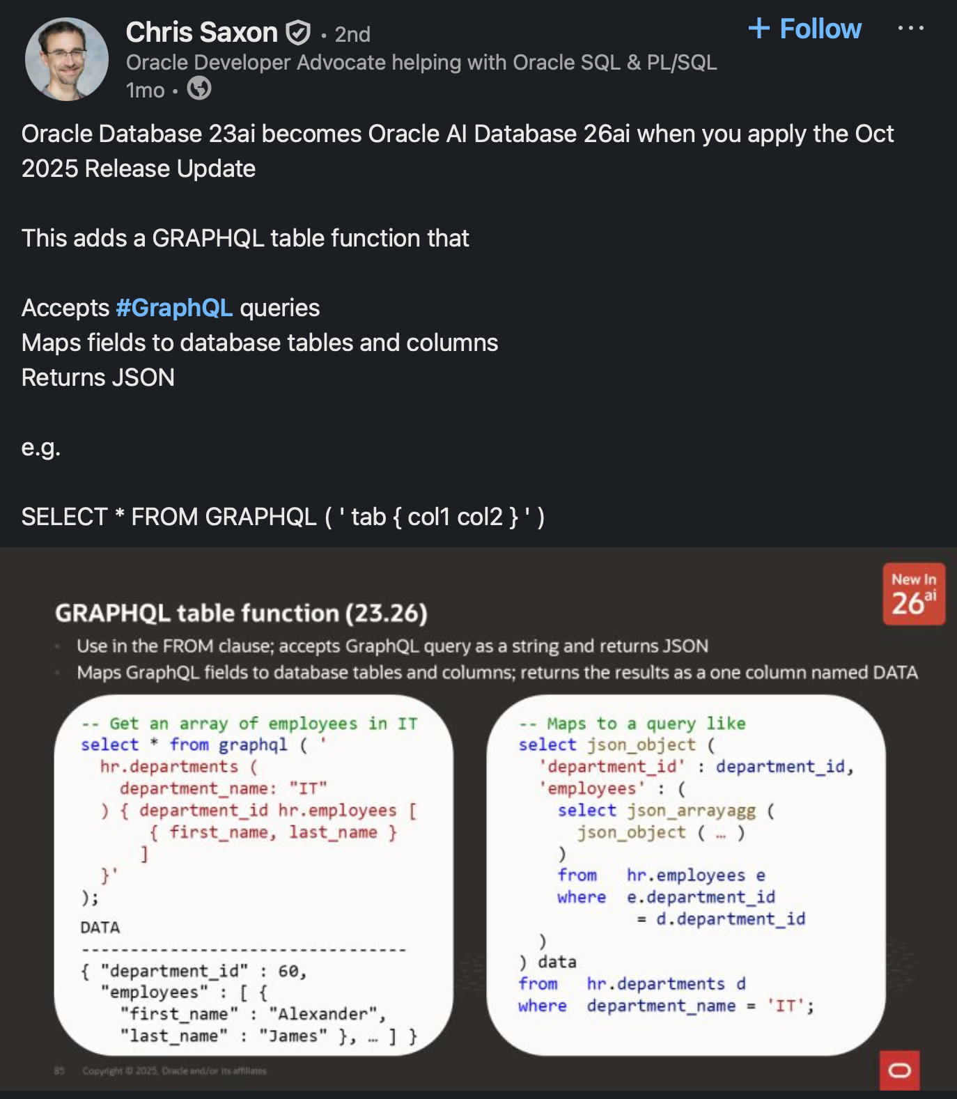 One of the most important things in Oracle 26AI is how it removes friction between your database and AI.